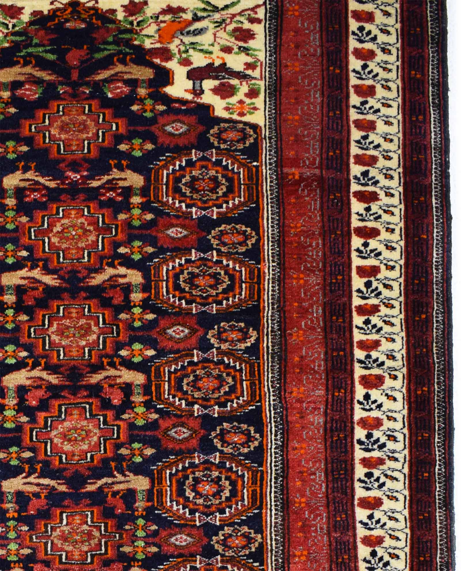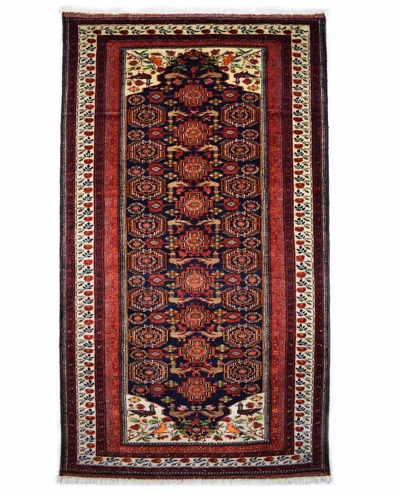 Hier ziet u een handgeknoopt nomadisch tapijt vanuit de Baluch regio gelegen in west-Iran. De afmetingen bedragen 156 cm op 90 cm. Dit is een stevig tapijt dat volledig gemaakt is van natuurlijke wol. Hierin kan men nomadische motieven en tekeningen herkennen.