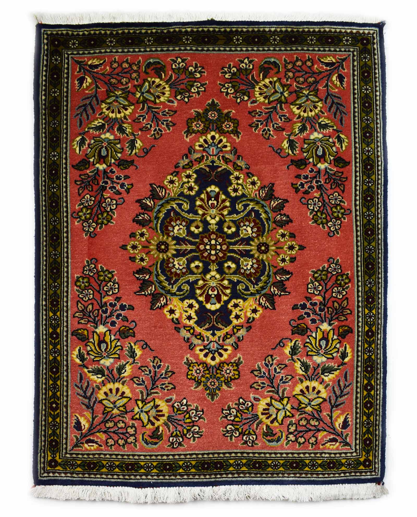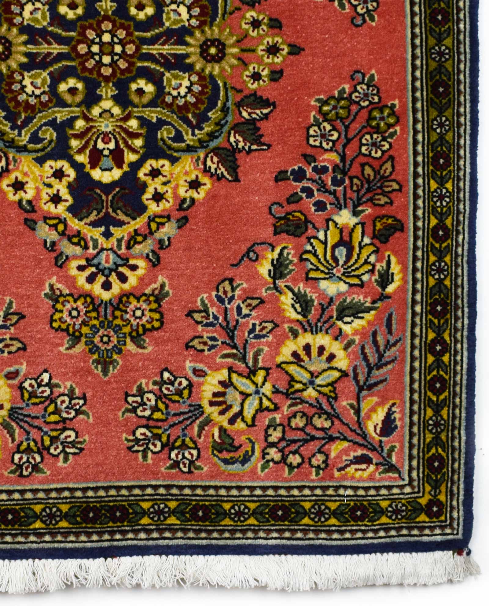 Dit tapijt is een Goum, gemaakt in centraal Iran. De afmetingen bedragen 87 cm op 64 cm. Goum is heel bekend voor de fijne kwaliteit van zowel de wollen als zijden tapijten. De typerende motieven zijn de bloemen motieven met mooie vaste kleuren.