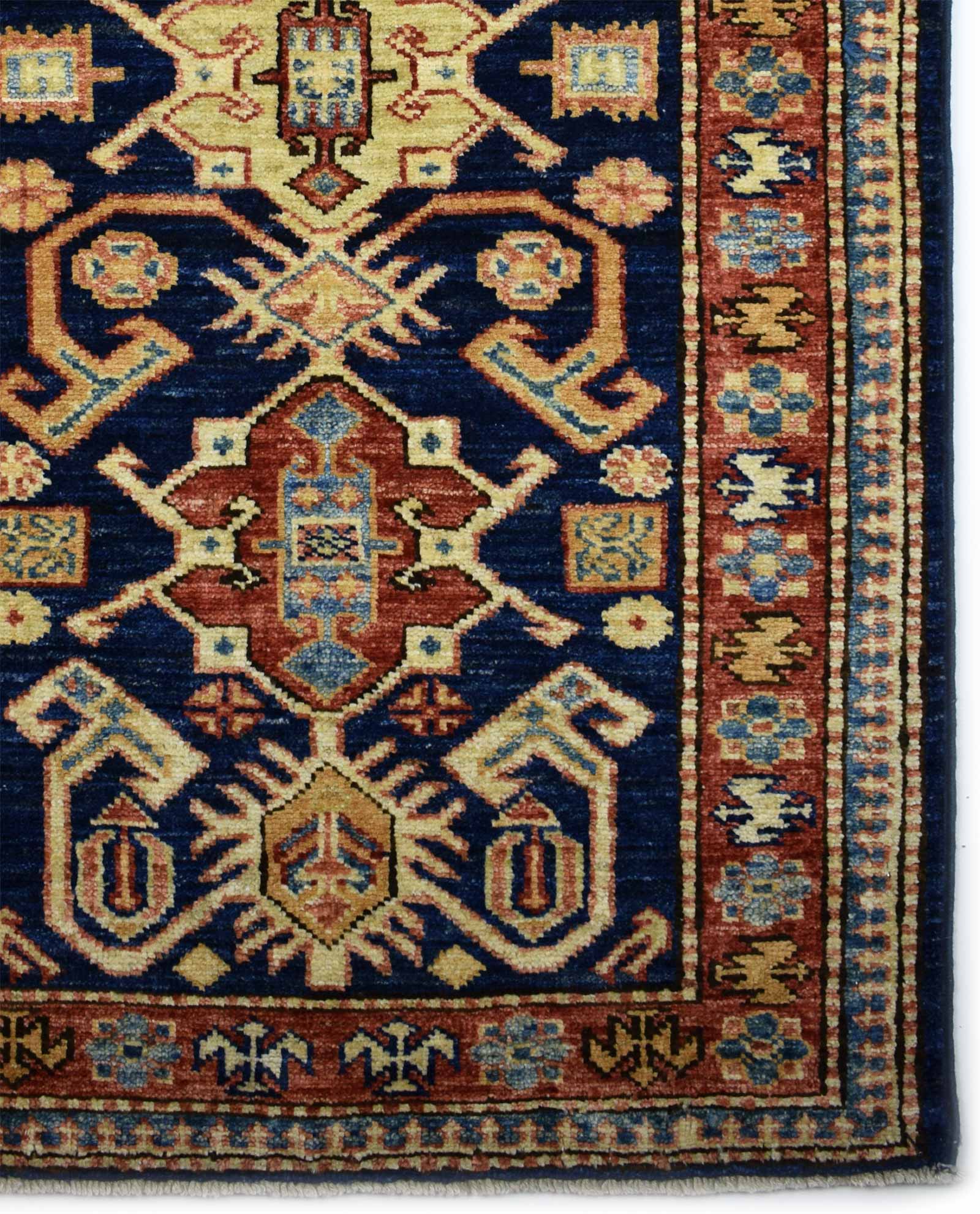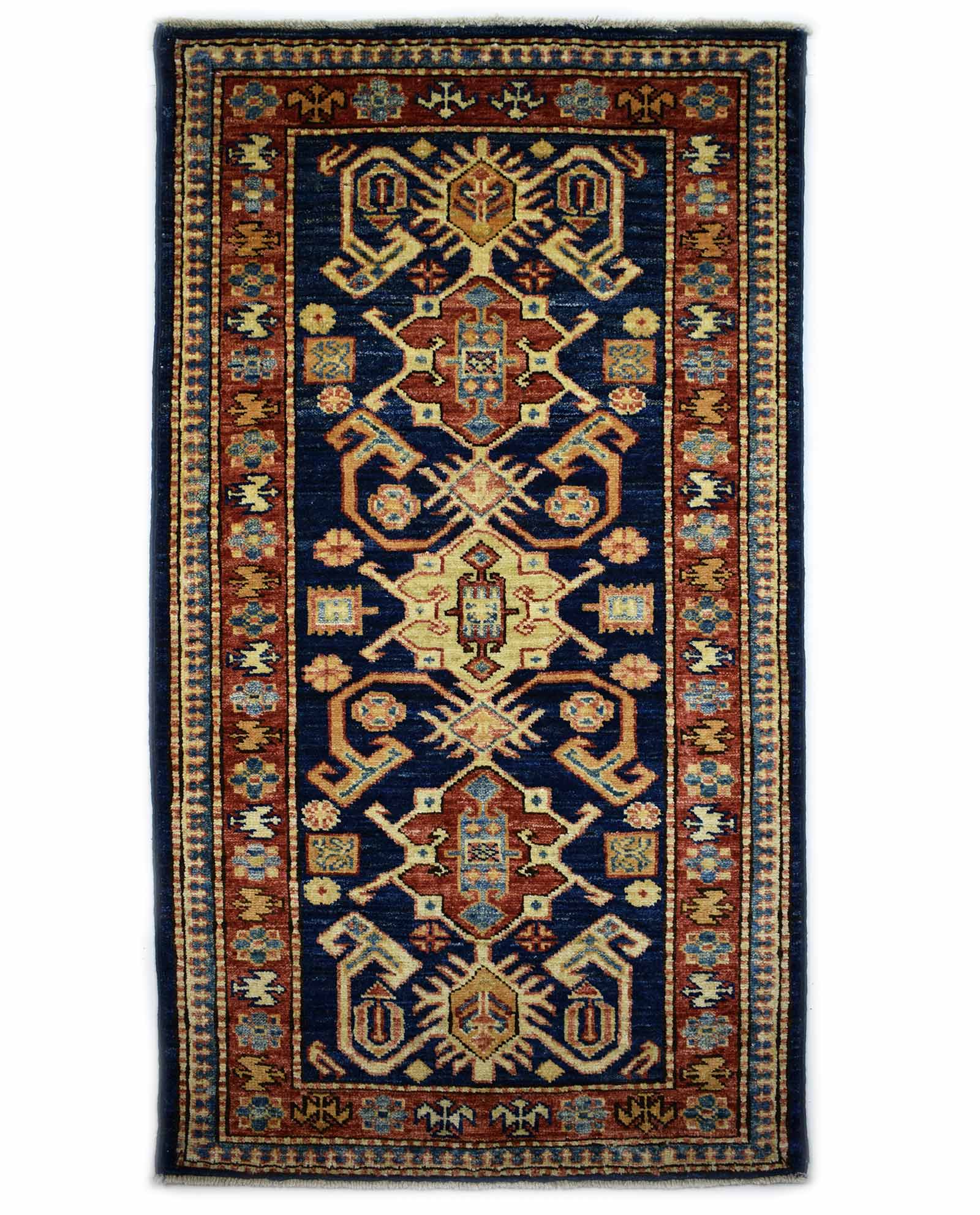 Deze Kazak is een tapijt gemaakt door Pakistaanse nomaden die zich Kazak noemen. De afmetingen bedragen 110 cm op 61 cm. Het is een Perzisch geïnspireerd tapijt gemaakt in Pakistan. Doordat het een nomadisch tapijt is kan men elementen vanuit de leefomgeving van de knopers herkennen, vaak zijn dit dieren. Het typische motief voor dit soort tapijten is het ‘Kaukasisch motief’.