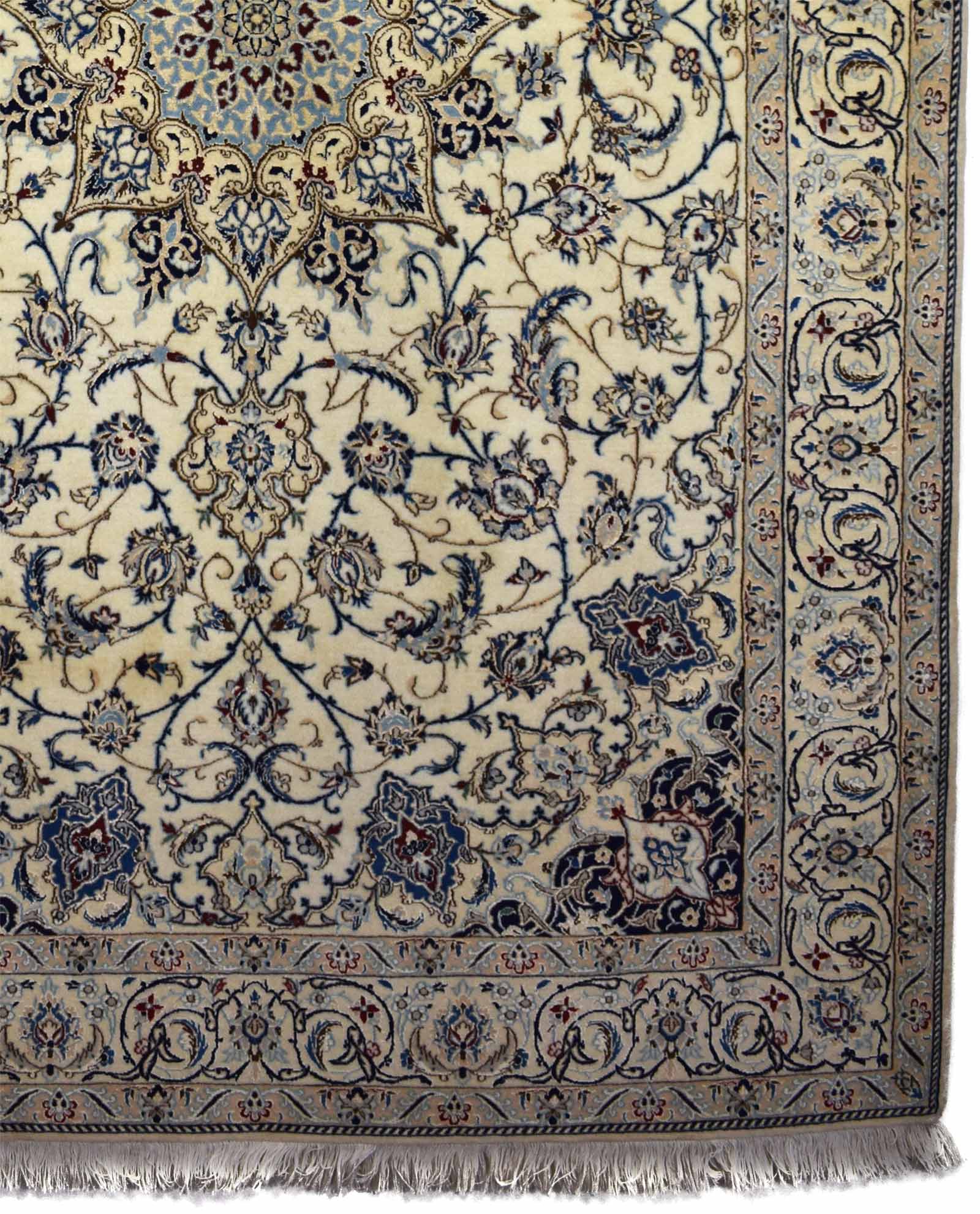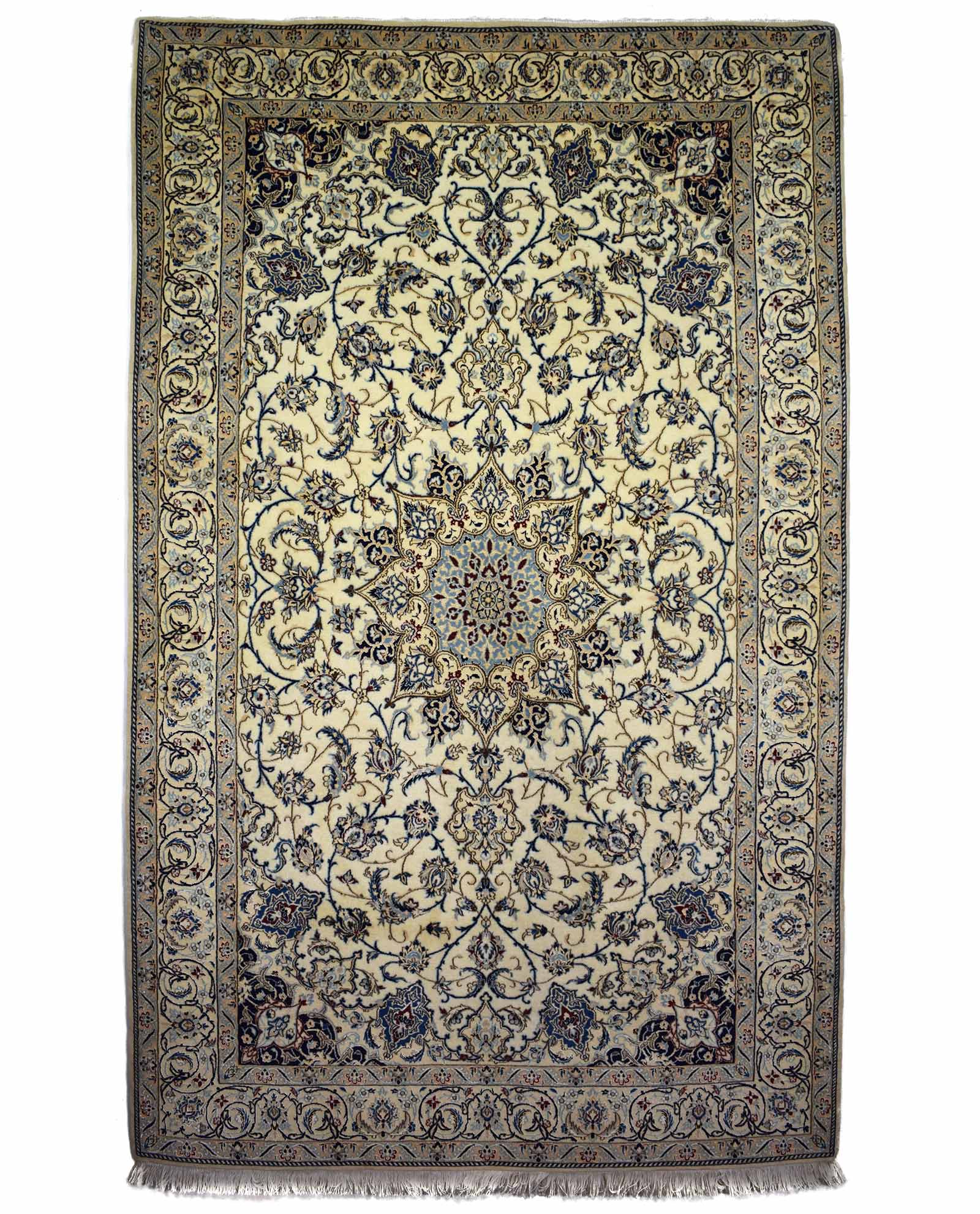 Hier ziet u een Nain 6La gemaakt in de stad Nain in het noorden van Iran. De afmetingen bedragen 210 cm op 134 cm. Kenmerkend voor de Nain is de mooie diepe blauwe kleur. 6La is binnen de tapijtknoopkunst een merk dat weergeeft hoe fijn een tapijt is, in het geval van 6La wilt dit zeggen dat het tapijt uiterst fijn is. De knoopdichtheid ligt rond 1 000 000 knopen per m².