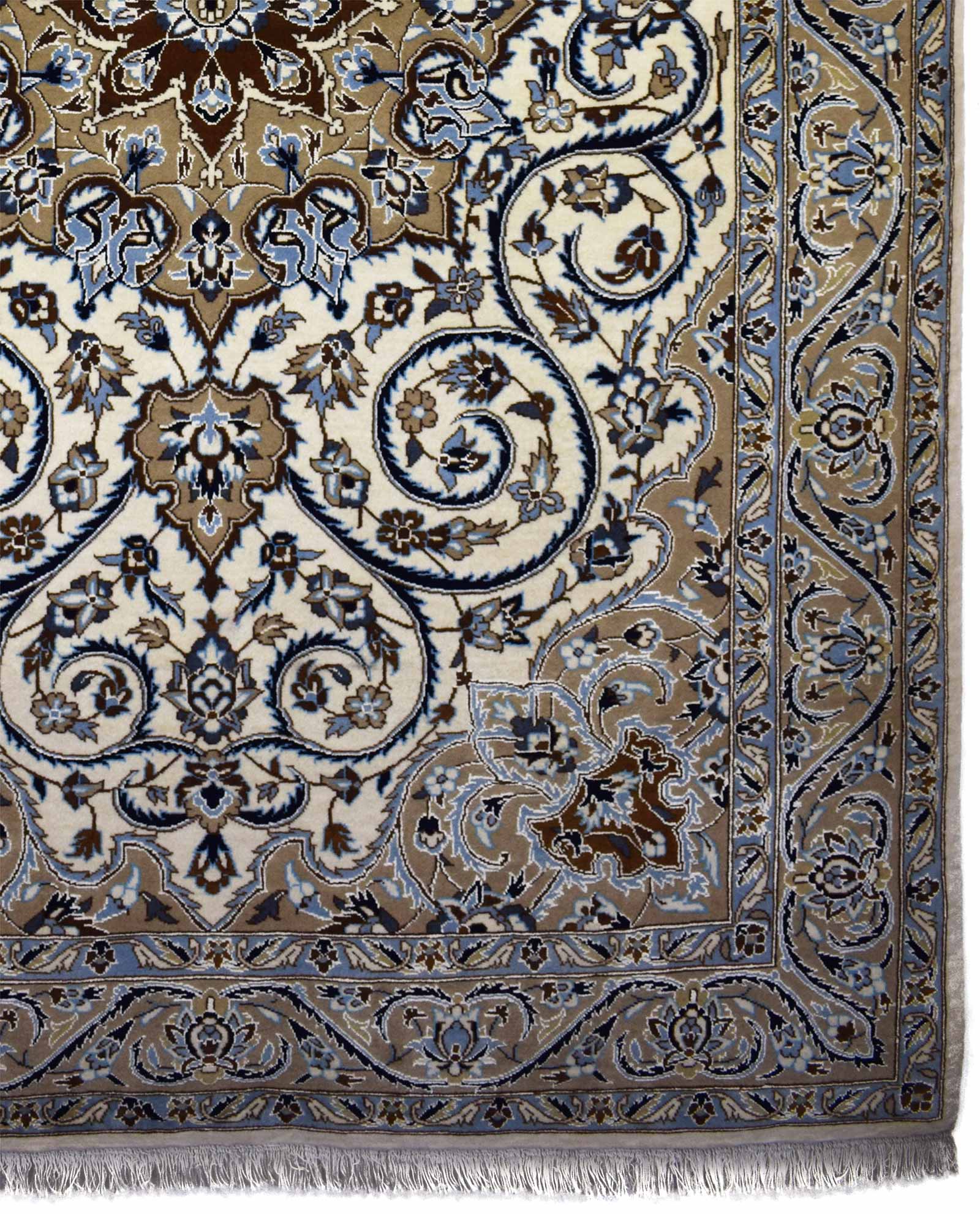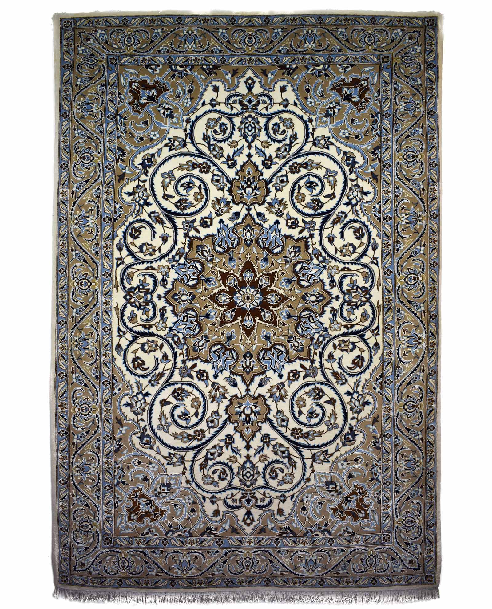 Hier ziet u een Nain 6La gemaakt in de stad Nain in het noorden van Iran. De afmetingen bedragen 203 cm op 153 cm. 9La is binnen de tapijtknoopkunst een kwaliteitsmerk dat weergeeft hoe fijn een tapijt is geknoopt, in het geval van 9La wilt dit zeggen dat het tapijt fijn is met 500 000 knopen per m². Wat hier opvalt is het mooie diepe indigo wat typerend is voor Nain.