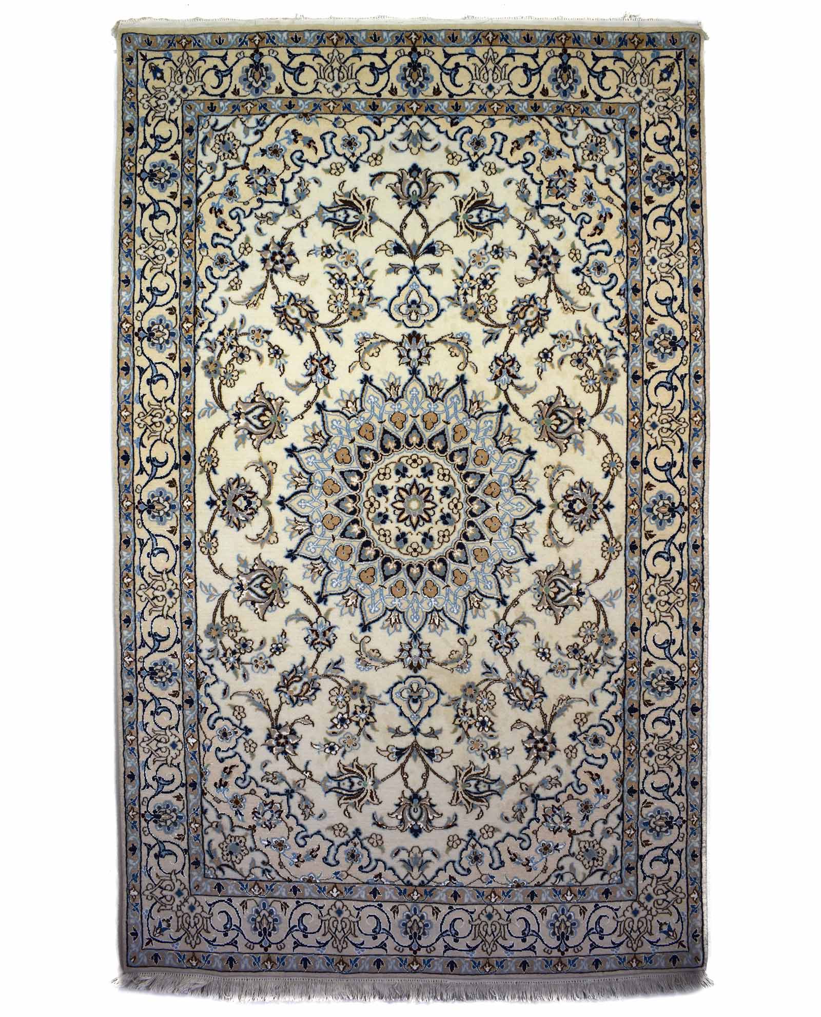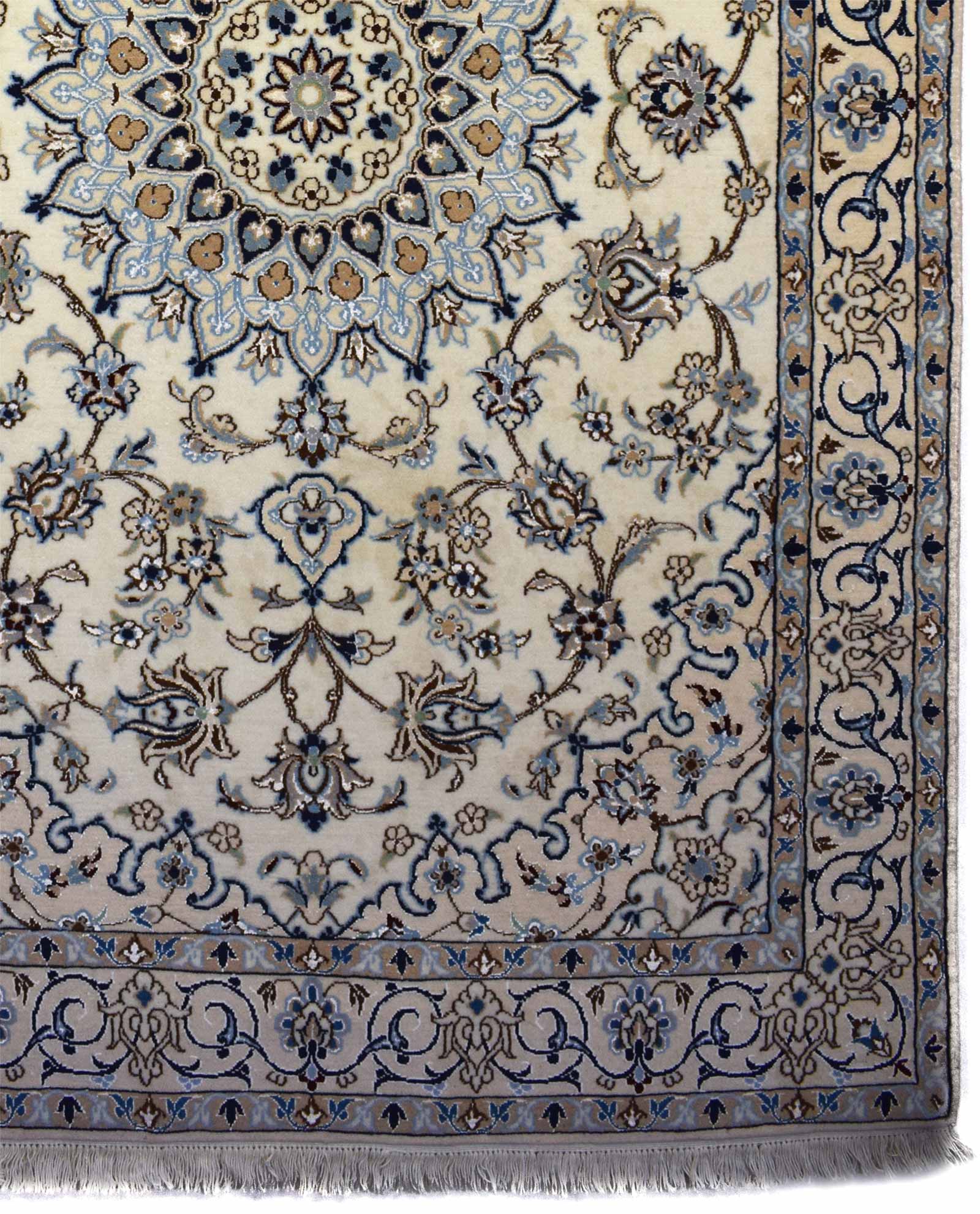 Deze Nain 9La gemaakt in de stad Nain in het noorden van Iran. De afmetingen bedragen 203 cm op 124 cm. Wat hier opvalt is het mooie diepe indigo wat typerend is voor Nain. 9La is binnen de tapijtknoopkunst een kwaliteitsmerk dat weergeeft hoe fijn een tapijt is geknoopt, in het geval van 9La wilt dit zeggen dat het tapijt fijn is met 500 000 knopen per m².