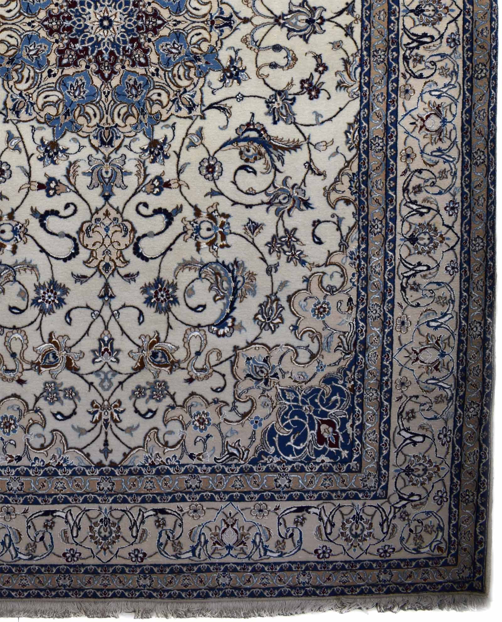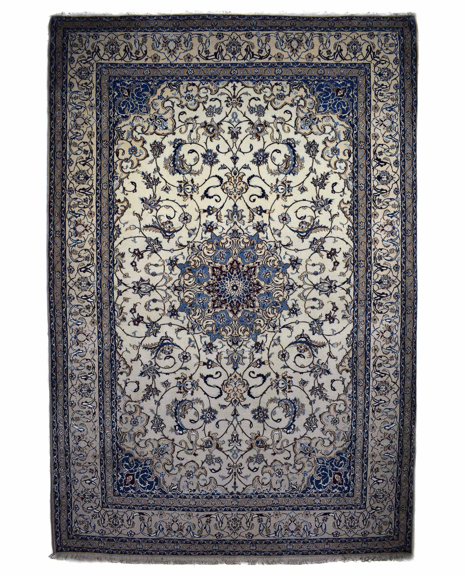 Hier ziet u een Nain 6La gemaakt in de stad Nain in het noorden van Iran. De afmetingen bedragen 255 cm op 172 cm. Wat hier opvallend is, is de lichte kleur die typerend is voor dit soort Nain. 6La is binnen de tapijtknoopkunst een merk dat weergeeft hoe fijn een tapijt is, in het geval van 6La wilt dit zeggen dat het tapijt uiterst fijn is. De knoopdichtheid is ongeveer 1 000 000 knopen per m².