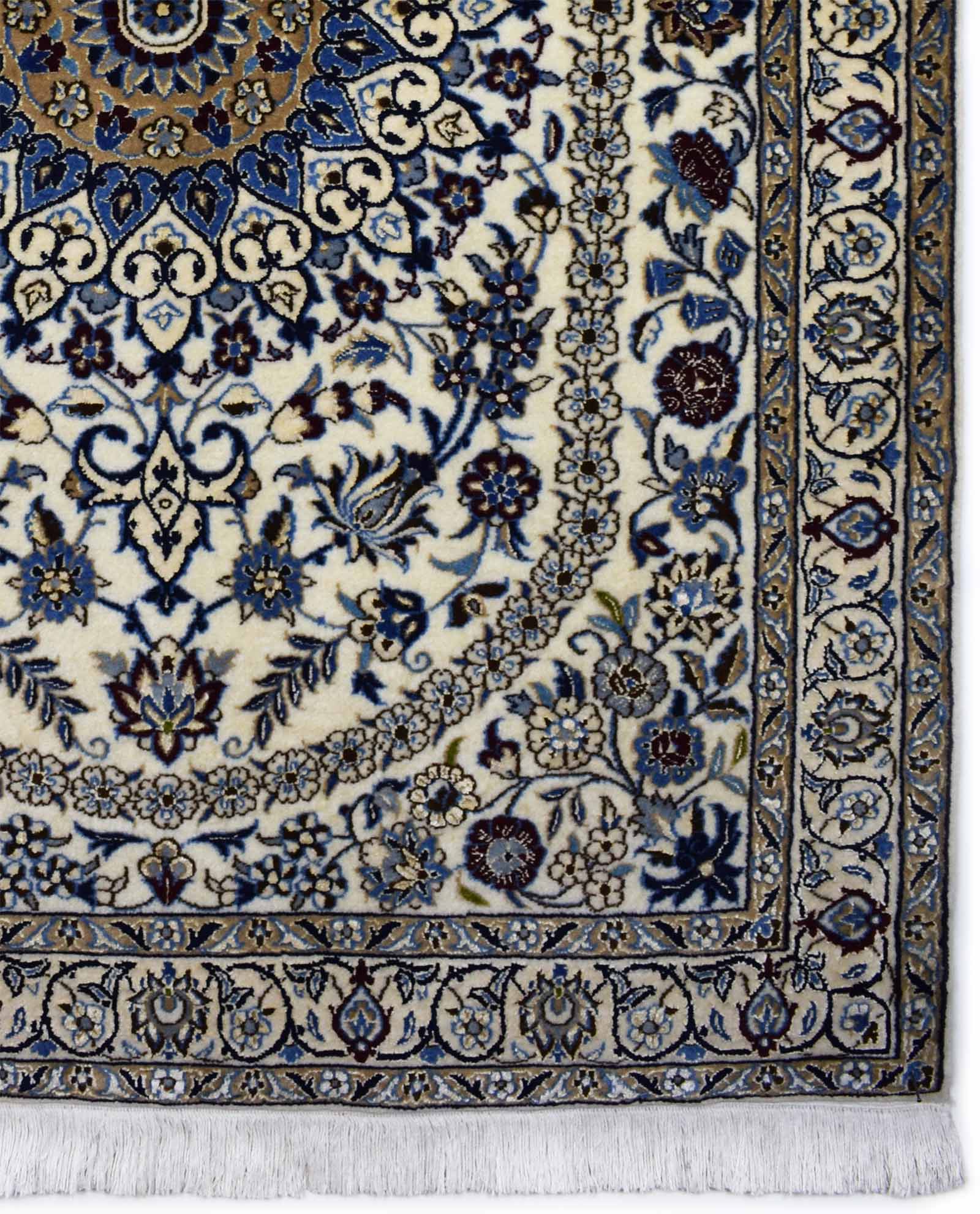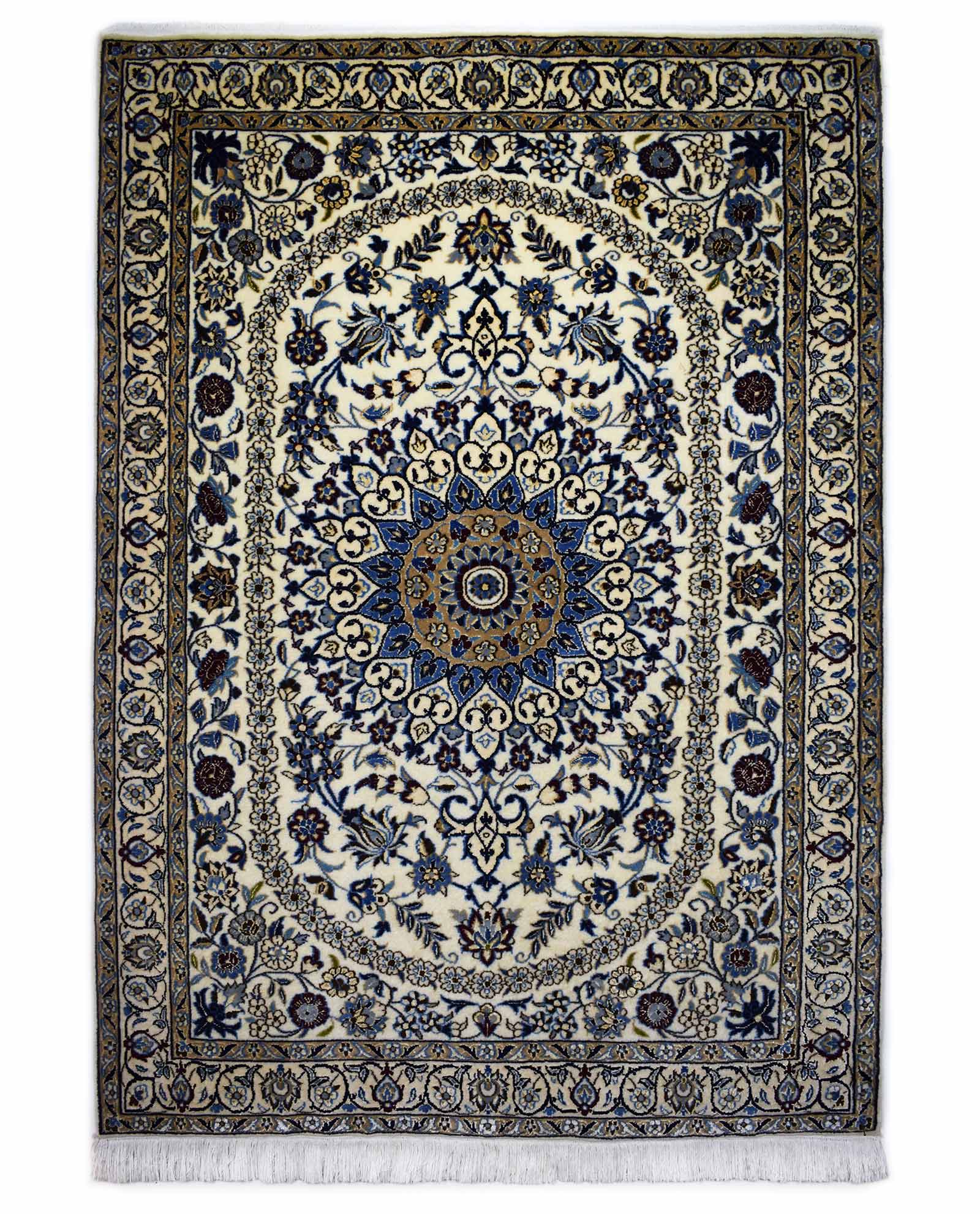Hier ziet u een Nain 6La gemaakt in de stad Nain in het noorden van Iran. De afmetingen bedragen 119 cm op 83 cm. Wat hier opvallend is, is de lichte kleur die typerend is voor dit soort Nain. 6La is binnen de tapijtknoopkunt een merk dat weergeeft hoe fijn een tapijt is, in het geval van 6La wilt dit zeggen dat het tapijt uiterst fijn is. De knoopdichtheid is ongeveer 1 000 000 knopen per m².