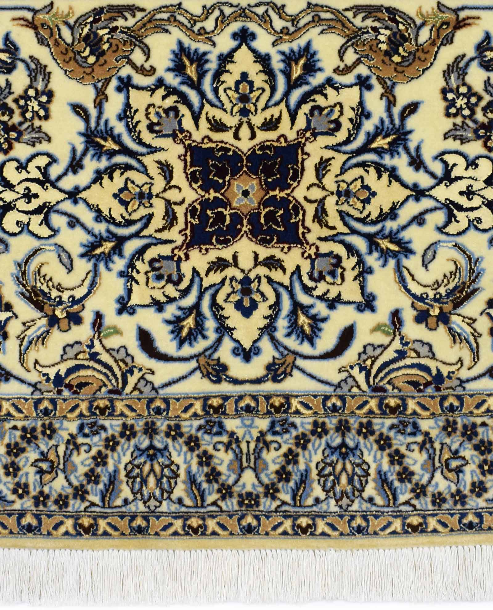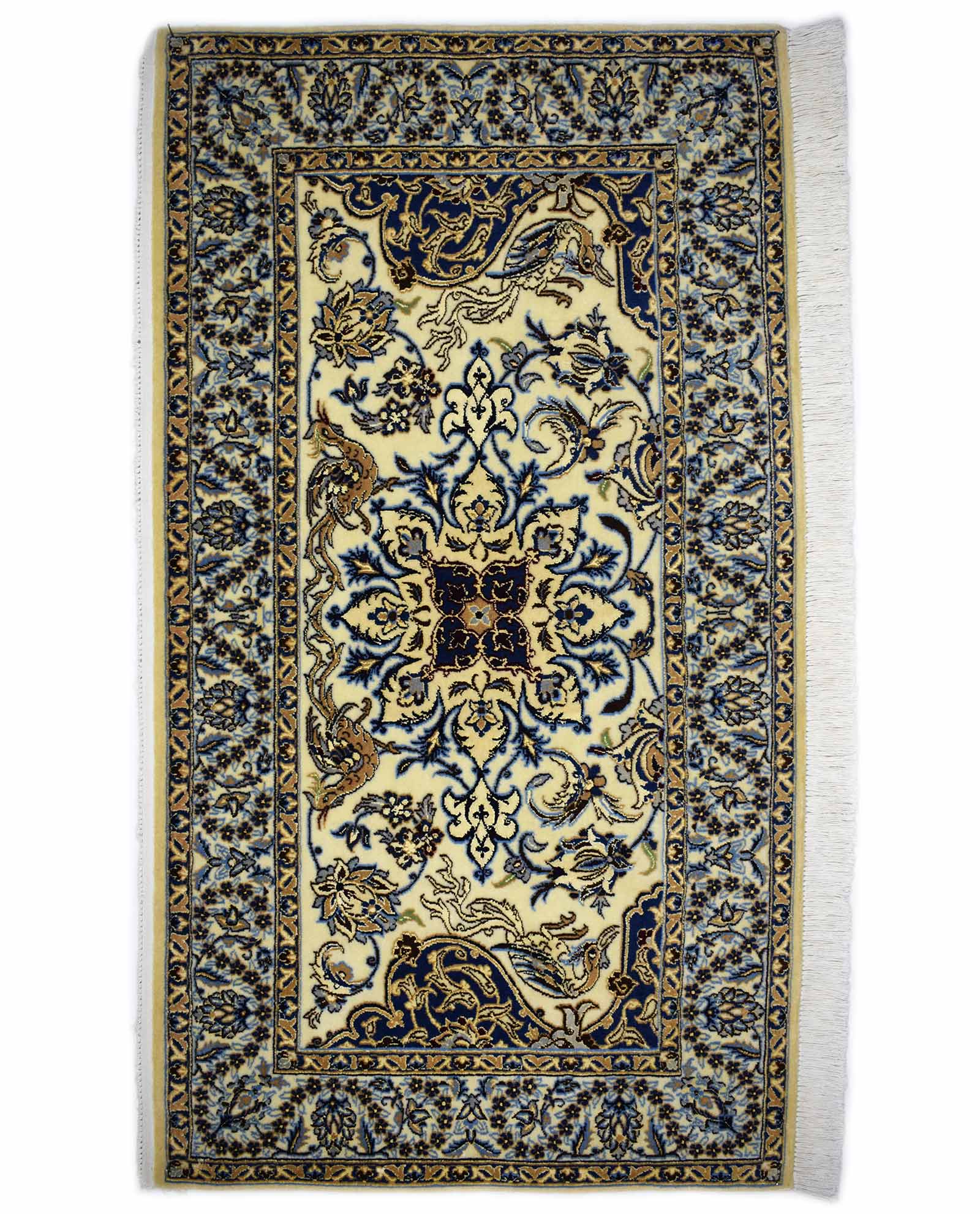 Hier ziet u een Nain 6La gemaakt in de stad Nain in het noorden van Iran. De afmetingen bedragen 110 cm op 60 cm. Wat hier opvallend is is de mooie lichte kleurencombinatie kleur die typerend is voor Nain. 6La is binnen de tapijtknoopkunst een merk dat weergeeft hoe fijn een tapijt is, in het geval van 6La wilt dit zeggen dat het tapijt uiterst fijn is. De knoopdichtheid ligt rond 1 000 000 knopen per m².