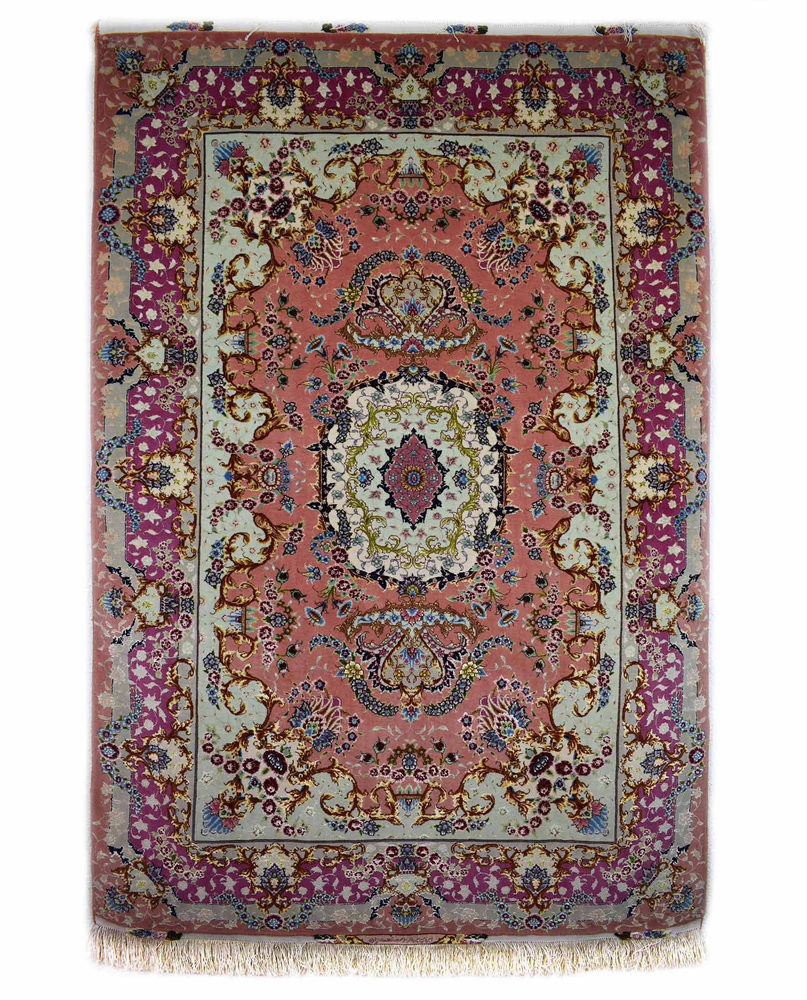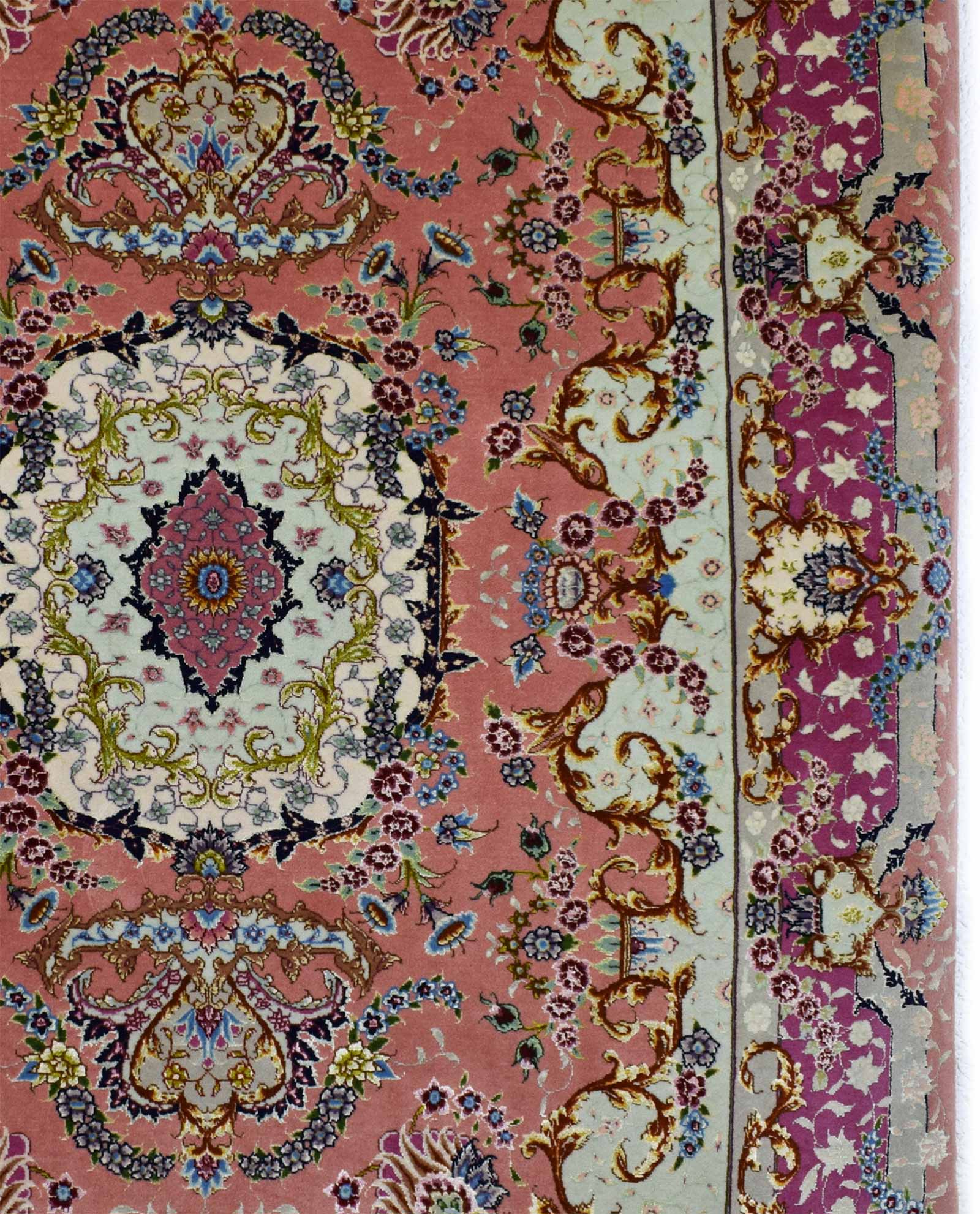 Deze Tabriz is geknoopt in Iran. De afmetingen bedragen 153 cm op 101 cm. De materialen in dit tapijt zijn wol en zijde. De wol is natuurlijk gekleurd. De knopen zijn gelegd op een zijden kettingdraad. De kleuren zijn eerder pastelkleuren wat dit exemplaar speciaal maakt. Opmerkelijk is ook de knoopdichtheid die meer dan 1.000.000 knopen per m² bedraagt en het bloemenpatroon.
