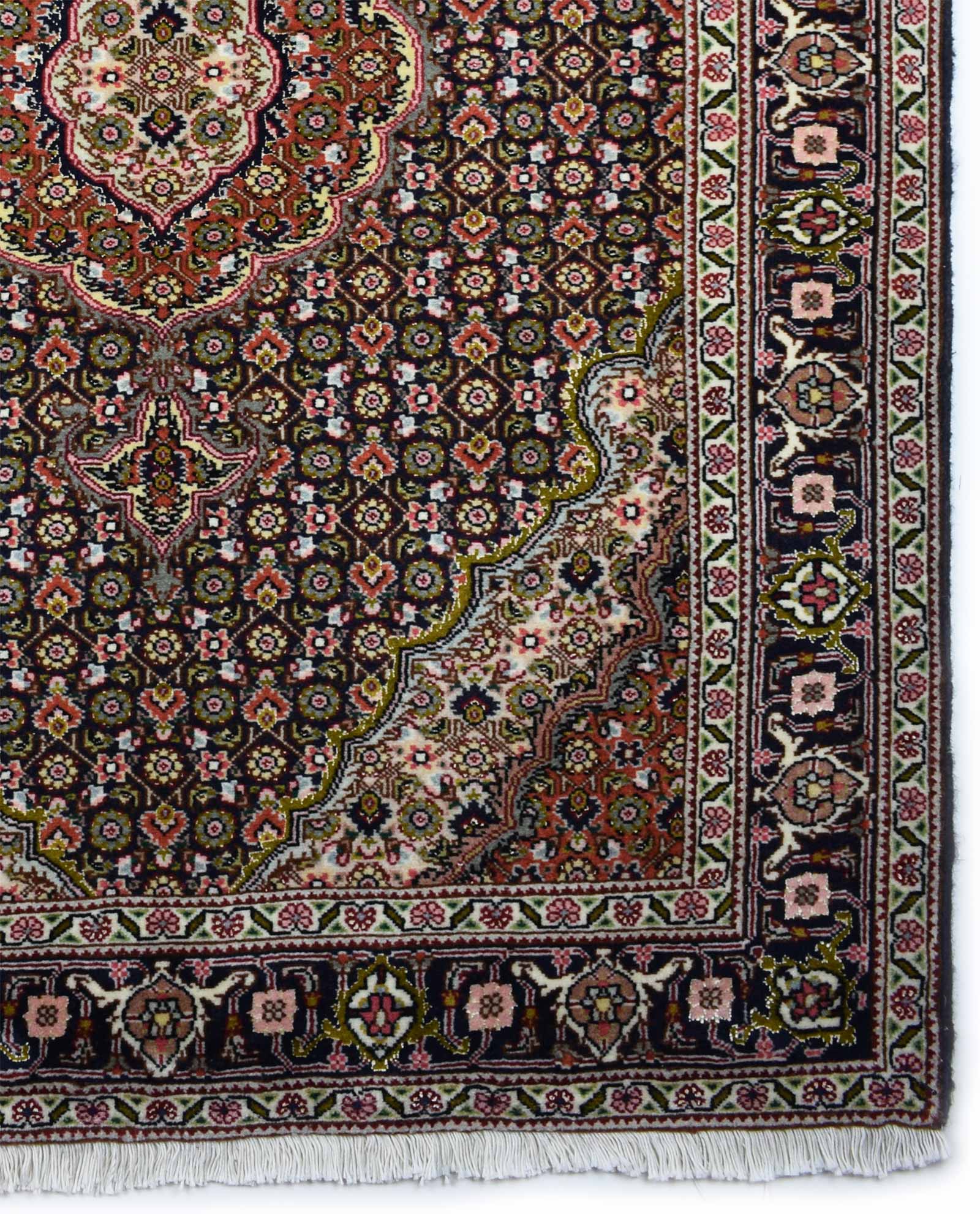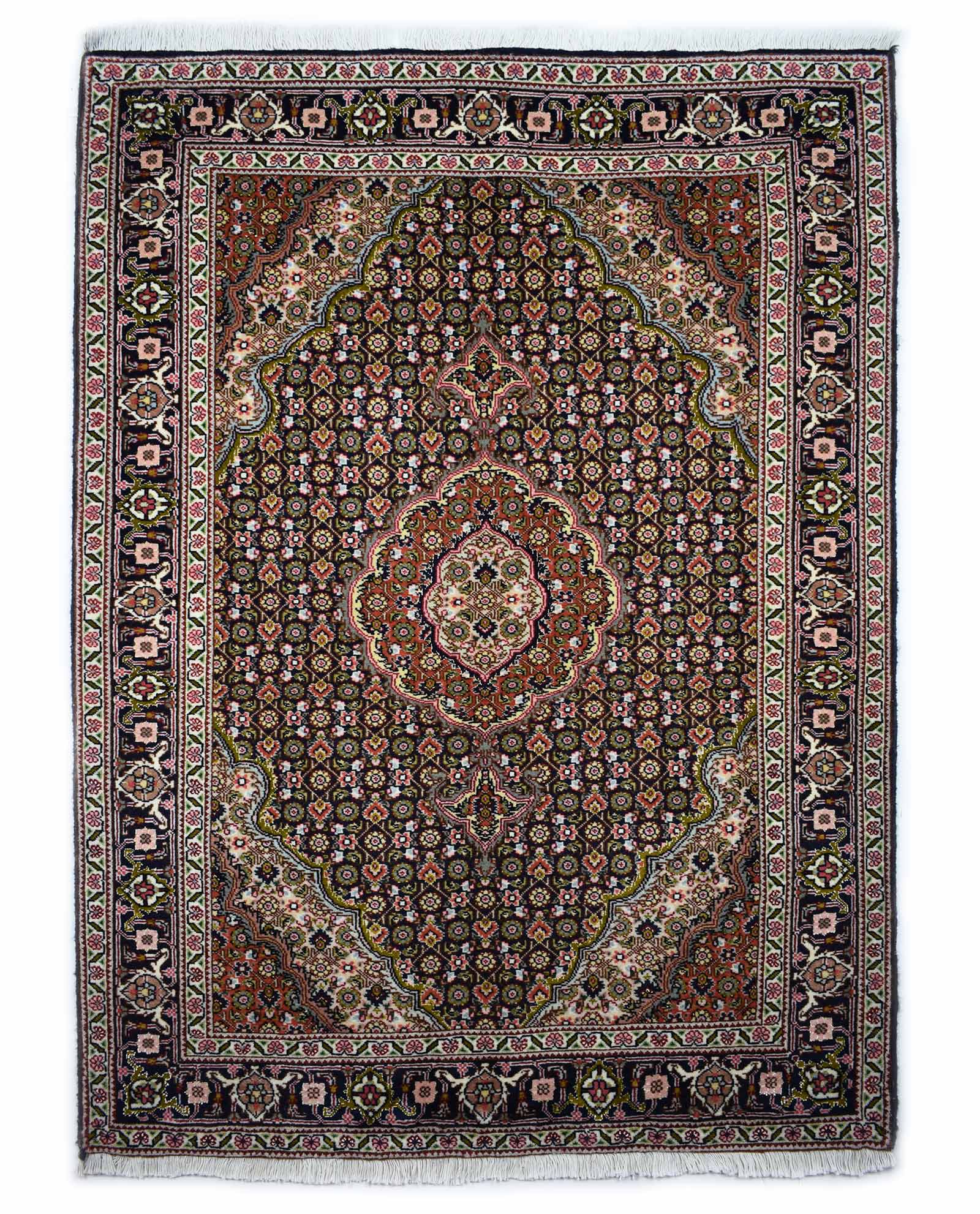 Dit tapijt is een Tabriz, geknoopt in Iran. De afmetingen bedragen 114 cm op 82 cm. Een zijden kettingdraad vormt de basis waarop de rest van de knopen gelegd worden. De gebruikte materialen in het tapijt zijn wol en zijde. De wol is natuurlijk gekleurd. Opmerkelijk is ook de knoopdichtheid die meer dan 500.000 knopen per m² bedraagt en het bloemenpatroon.