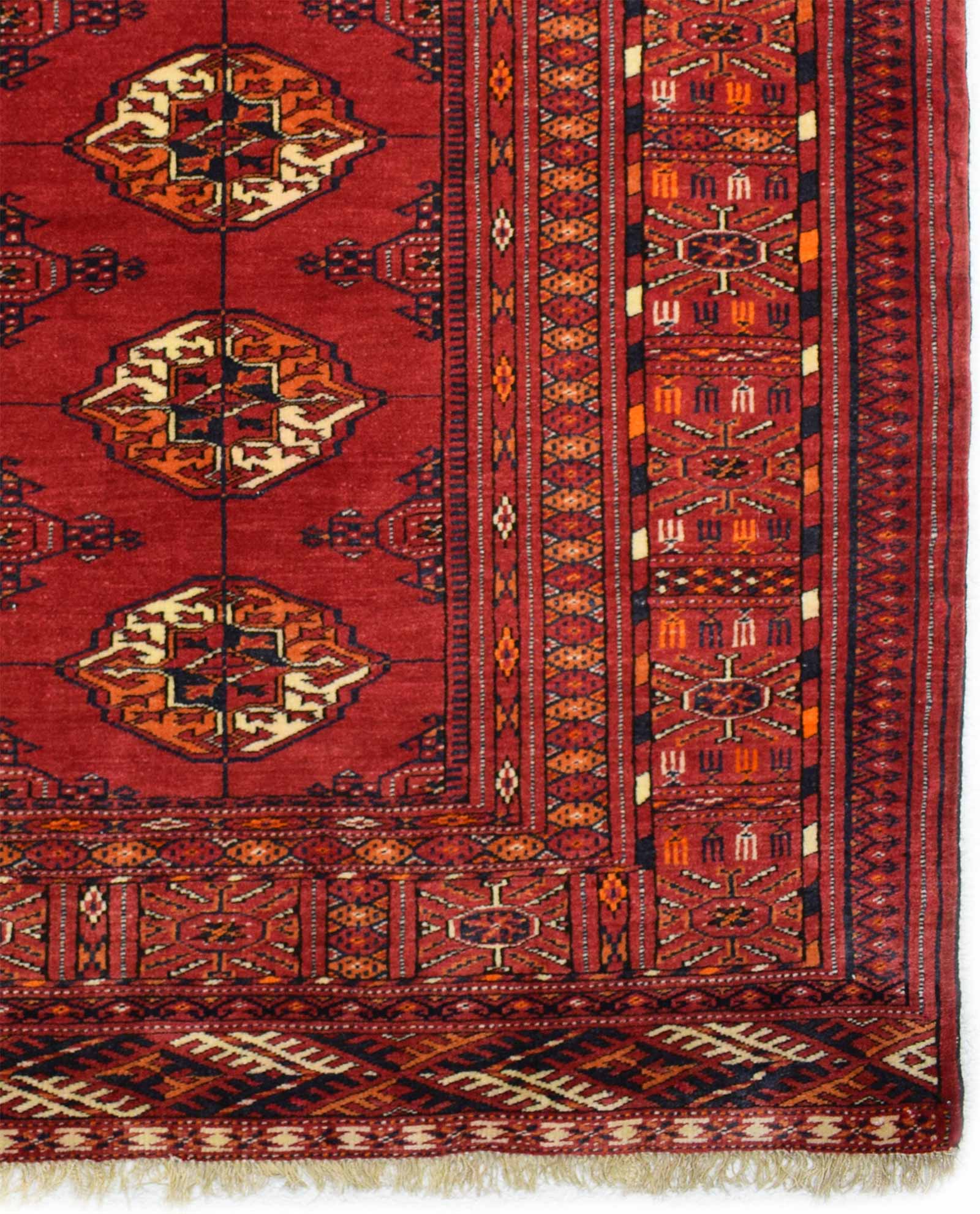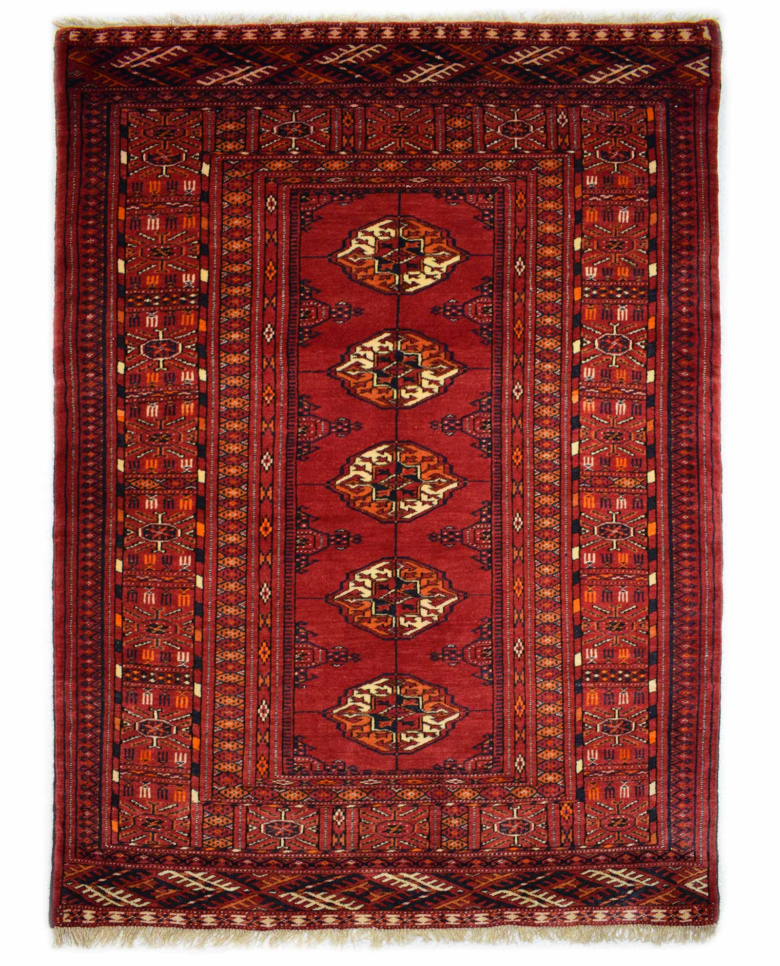 Het tapijt dat u hier ziet noemt men een Torkman en is geknoopt in Iran. De afmetingen bedragen 128 cm op 93 cm. Dit tapijt is een nomadisch tapjt van de Torkman nomaden, omdat de tekeningen van dit vloerkleed gebaseerd zijn op de natuur heeft het een kalme aard. Het motief is tijdloos. Wat opmerkelijk is is dat dit tapijt geknoopt is op een zijden kettingdraad.
