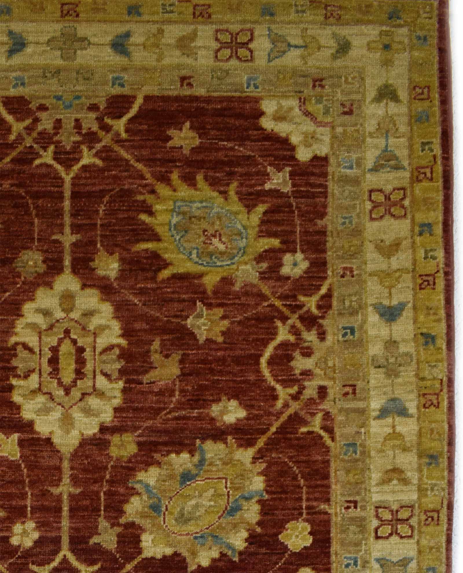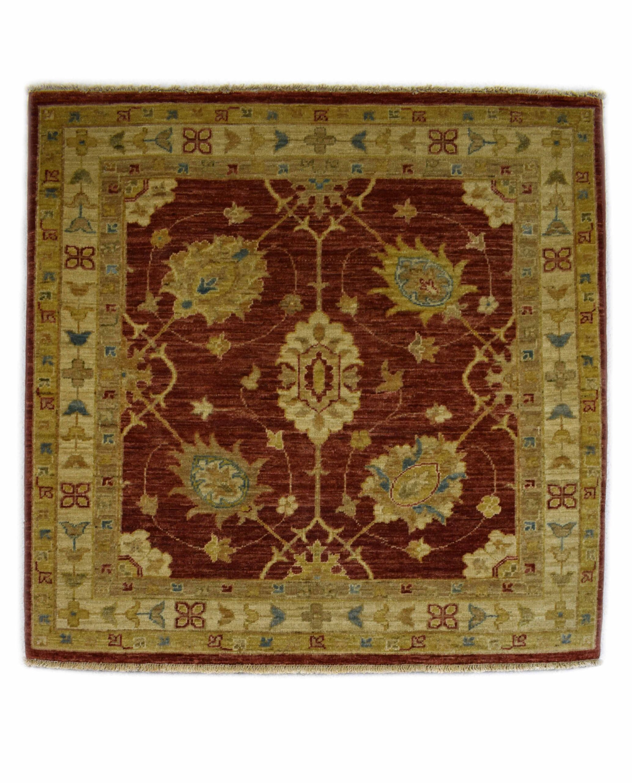 Dit tapijt is geknoopt in Pakistan, de afmetingen bedragen 97 cm op 96 cm. Dit is een vierkant tapijt, wat niet vaak voorkomt in dit genre. De warme kleuren rondom de boord en het midden van dit tapijt stralen rust uit. De wol is met de hand gesponnen en het kleuren gebeurt strikt op basis van plantaardig materiaal.
